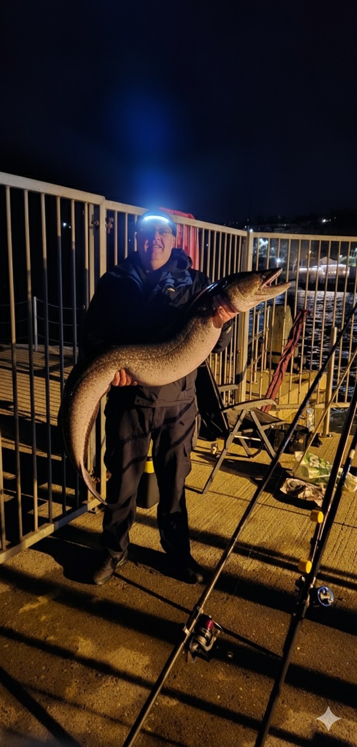 Kevin Peach has caught what could have been North Devon’s biggest ever shore caught conger. The huge eel estimated at 47lb was caught from Ilfracombe Pier. Big conger are fish that often stimulate stories of the one that got away as they are very powerful fish that often leave anglers tackle in tatters. The biggest eel from North Devon’s shoreline that I have previously reported on was caught by Mark Frith and weighed 43lb.