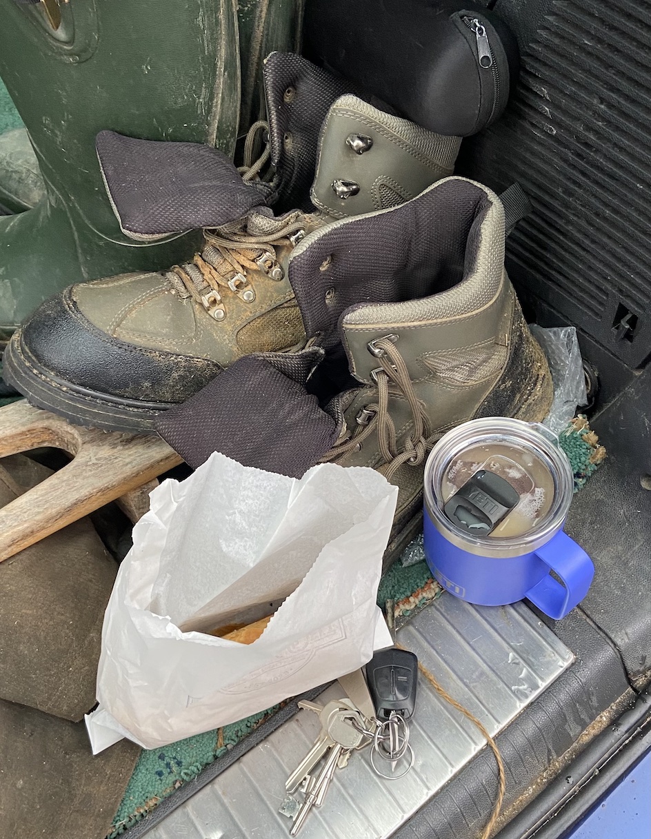 I wade back under the old stone road bridge and stroll back to the car where I finish off a Luke warm coffee and cold sausage roll that I left unfinished in my eagerness to embrace the waters edge. As I un tackle I congratulate myself on returning at the days end with the same two flies. As despite one or two tangles I have denied the trees and river snags any offerings; a rare accomplishment for this at times inexpert dangler.