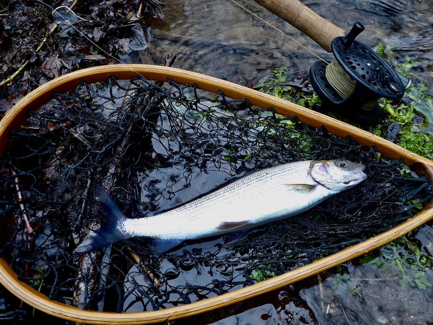 Its starting to rain heavily as I approach a pleasing looking glide that speaks of fish as I read the water. The drift commences the bright leader tightens and a silver grayling gyrates in the water as the rod flexes. My prize slides over the waiting net and I admire her bright beauty that contrasts with the grey winter day. I take a quick picture before slipping her back into her watery home; and away as they say on ‘Gone Fishing’.