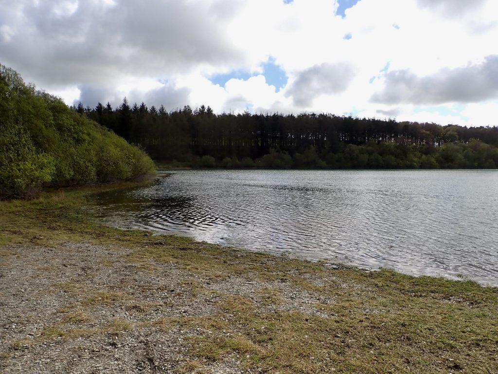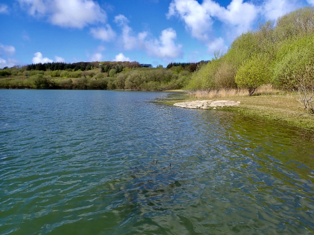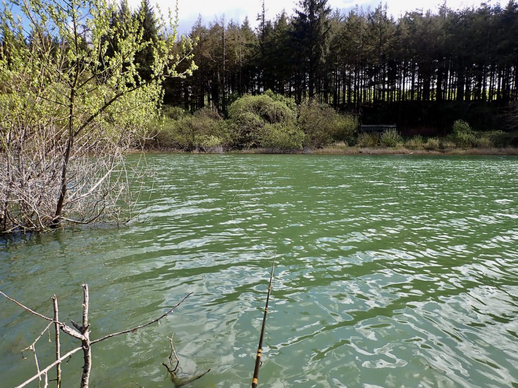 I promised Rodney Wevill who organises the Fluff Chucker events that that I would give an update on Wistlandpound before the next Brown Trout Masters event on May 2nd. So on April 18th I set off for quick fish around the lake. On arrival it was pleasing to hear the call of chiff chaffs in the fresh green trees. Parking in the lower Car park I walked down across the dam noting that the reservoir level is around 4ft below top water level. There was also a green tinge to the water indicating an algae bloom a frequent issue this reservoir over the years.